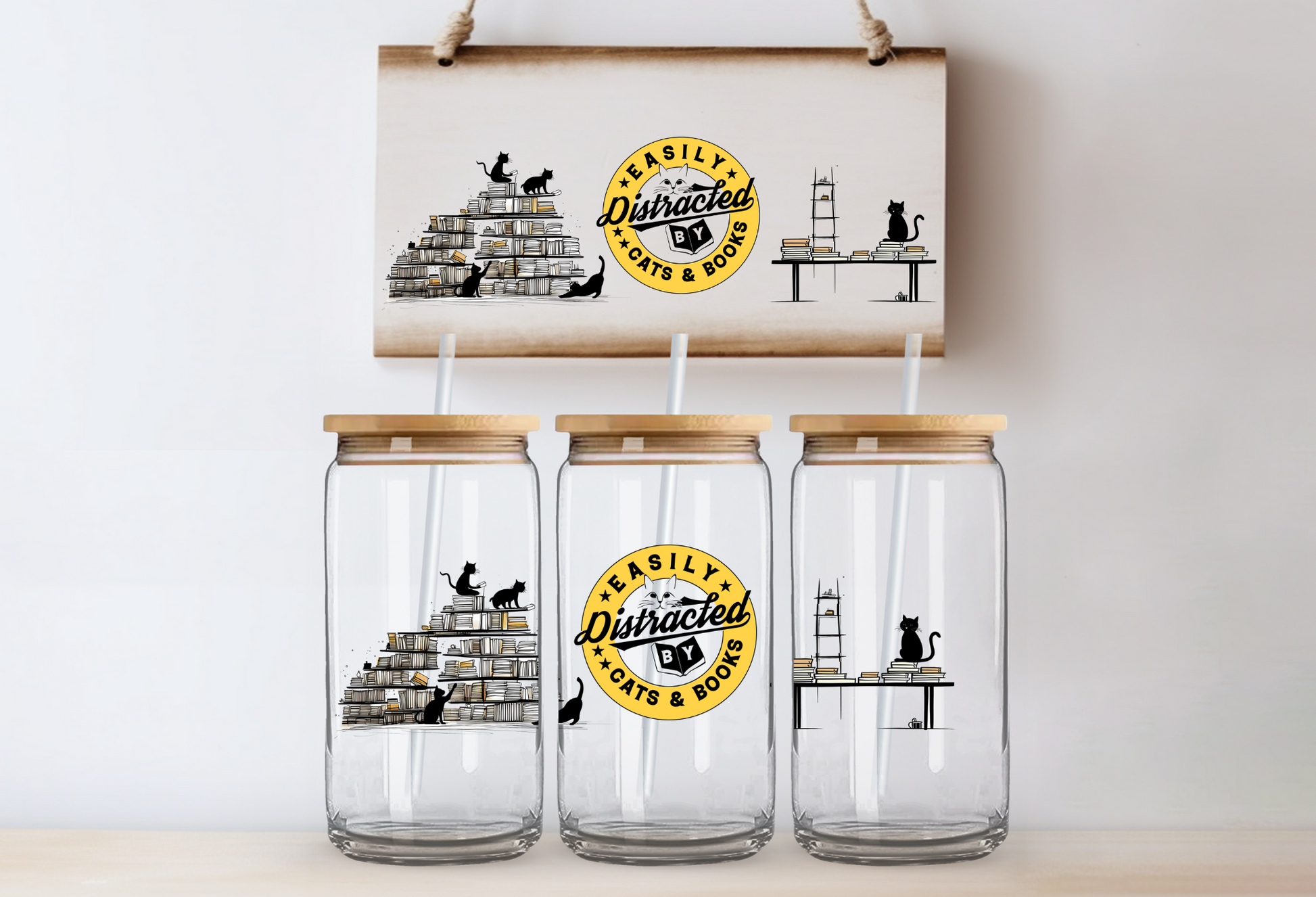 UVDTF 16oz CUP WRAP -Easily Distracted By Books & Cats